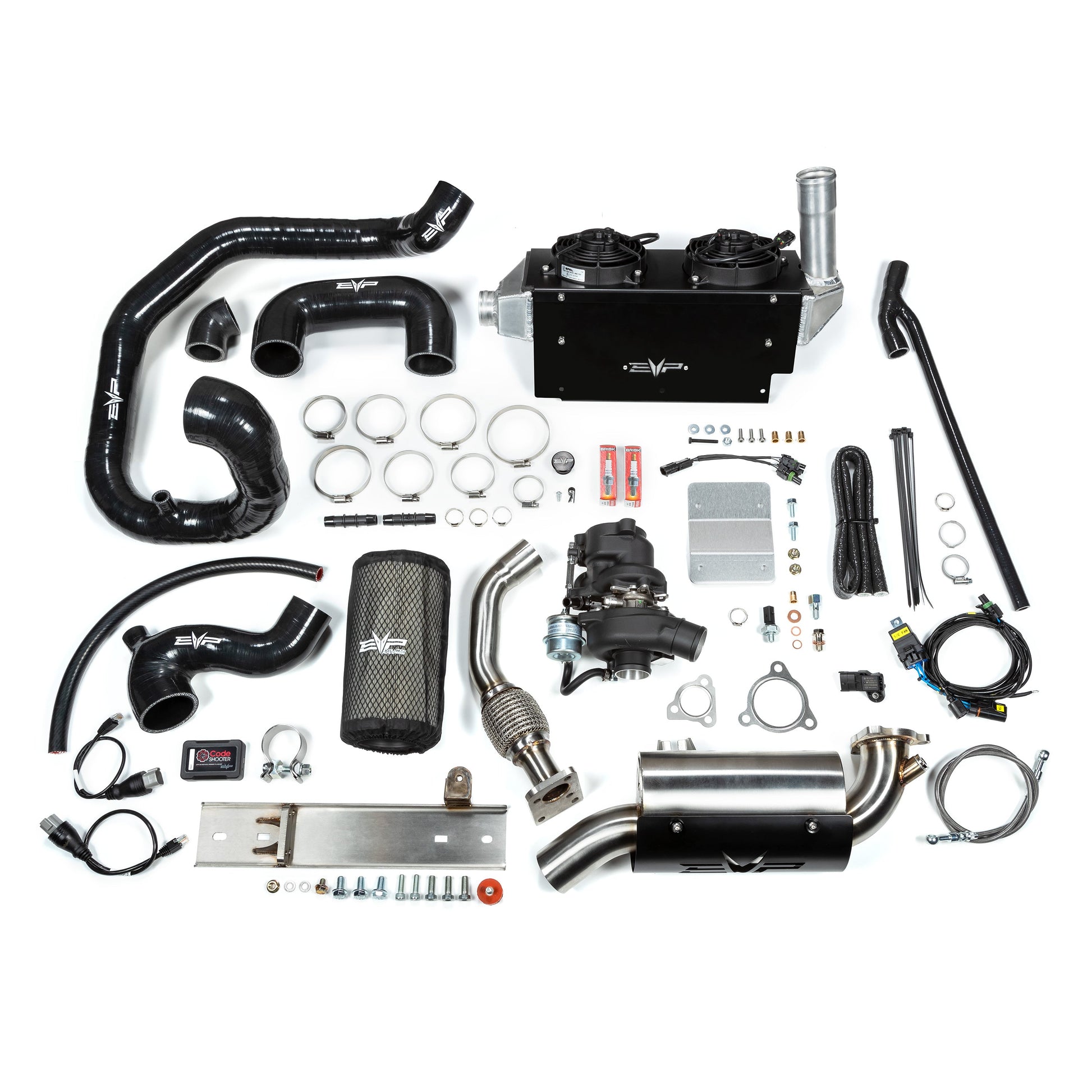 The EVP DT-130 and DT-195 Turbo Systems amplify everything you love about the HD10 platform by transforming it into a completely different monster thanks to smooth and consistent power delivery. These complete bolt-on, intercooled turbo systems are meticulously designed and engineered from the ground-up in-house using only the highest quality components. The turbocharger unit features an OEM-style German application Schwitzer oil-cooled journal bearing CHRA turbocharger that is properly sized for the power output of the Rotax V-Twin engine. The complete turbocharger is ceramic-coated black, which offers a clean appearance as well as added durability. The ceramic coating also helps keep radiant heat in check to maintain exceptional exhaust velocity and responsive boost response.